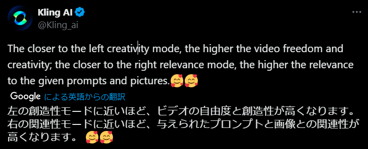 KLING AIの公式Xアカウント(@Kling_ai)では、Creativity・Relevanceスライダーを、AIによる動画生成の解釈と、入力(テキストプロンプト、およびアップロードされた画像)への忠実度を調整するものとして紹介しています。