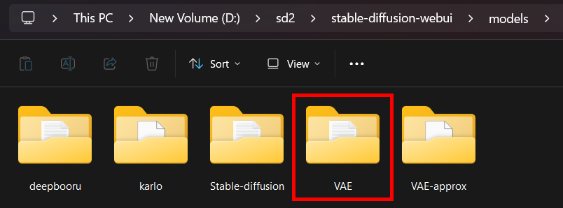 「stable-diffusion-webui」⇒「models」⇒「VAE」にダウンロードしたVAEファイルを設置します。