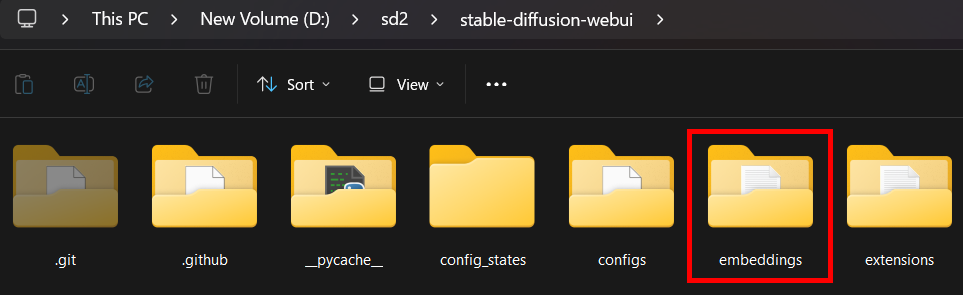 「stable-diffusion-webui」⇒「embeddings」にダウンロードしたembeddingsファイルを設置します。