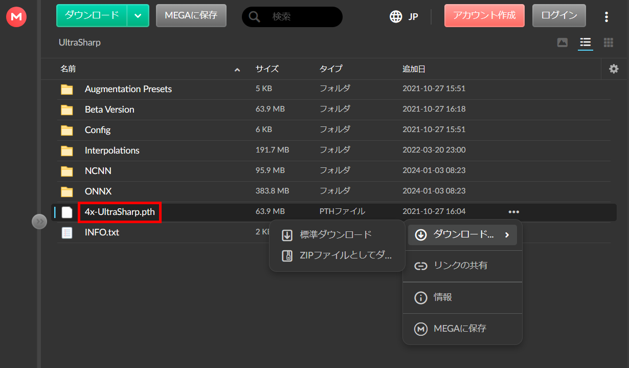 ALT+Fで「4x-UltraSharp」を検索、MEGAのダウンロードページより「4x-UltraSharp.pth」をダウンロードする。