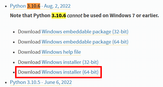 CTRL+Fで「3.10.6」を検索、「Windows installer (64-bit)」をダウンロード。