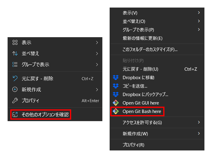 インストールするフォルダ内で右クリック、「その他のオプションを確認」⇒「Open Git Bash here」を選択。