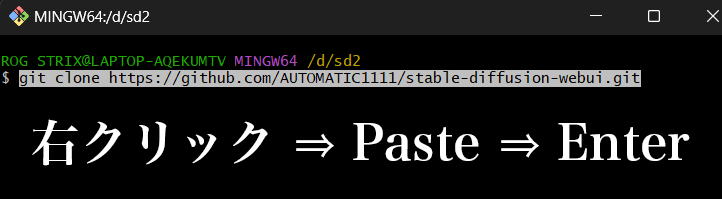 下記のコードをコピー、Git Bashに右クリックからペースト ⇒ Enterキーでコマンドを実行する。
